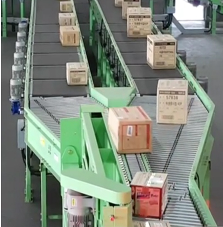 Merge roller conveyor is skewed roller conveyor used to merging two input lines in a product with high throughput.