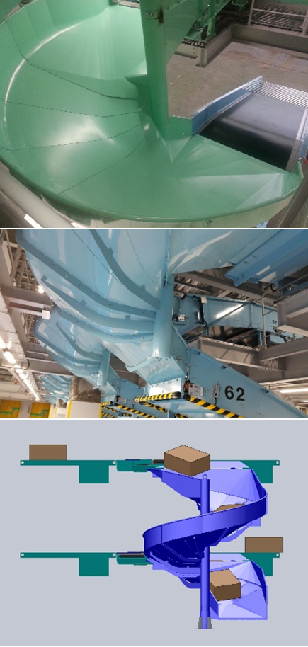The mild steel spiral chute offers significant benefits over existing conventional designs. Material move through the chute at a constant velocity, due to computer aided design. The possibility of breakdown is eliminated, since there is no power source, other than gravity and no moving parts. There is minimal cost involved with operation and maintenance. The low friction surface material has excellent sliding qualities which remain unaffected by unfavorable conditions such as high humidity. The chute can be utilized for accumulation with surface material to permit self-starting of product that has been stopped in the chute. The chute is very durable and the surface is extremely wear resistant, has insuring longer life. The chute requires no supervision or controls. The chute is inexpensive and requires very little time to install compared to other alternatives.